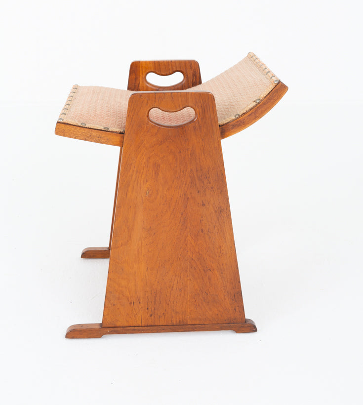 This Stylish Piano Stool Stands Upon Sleigh Feet and Features Slab Ends With Carrying Handles and a Shaped Seat.