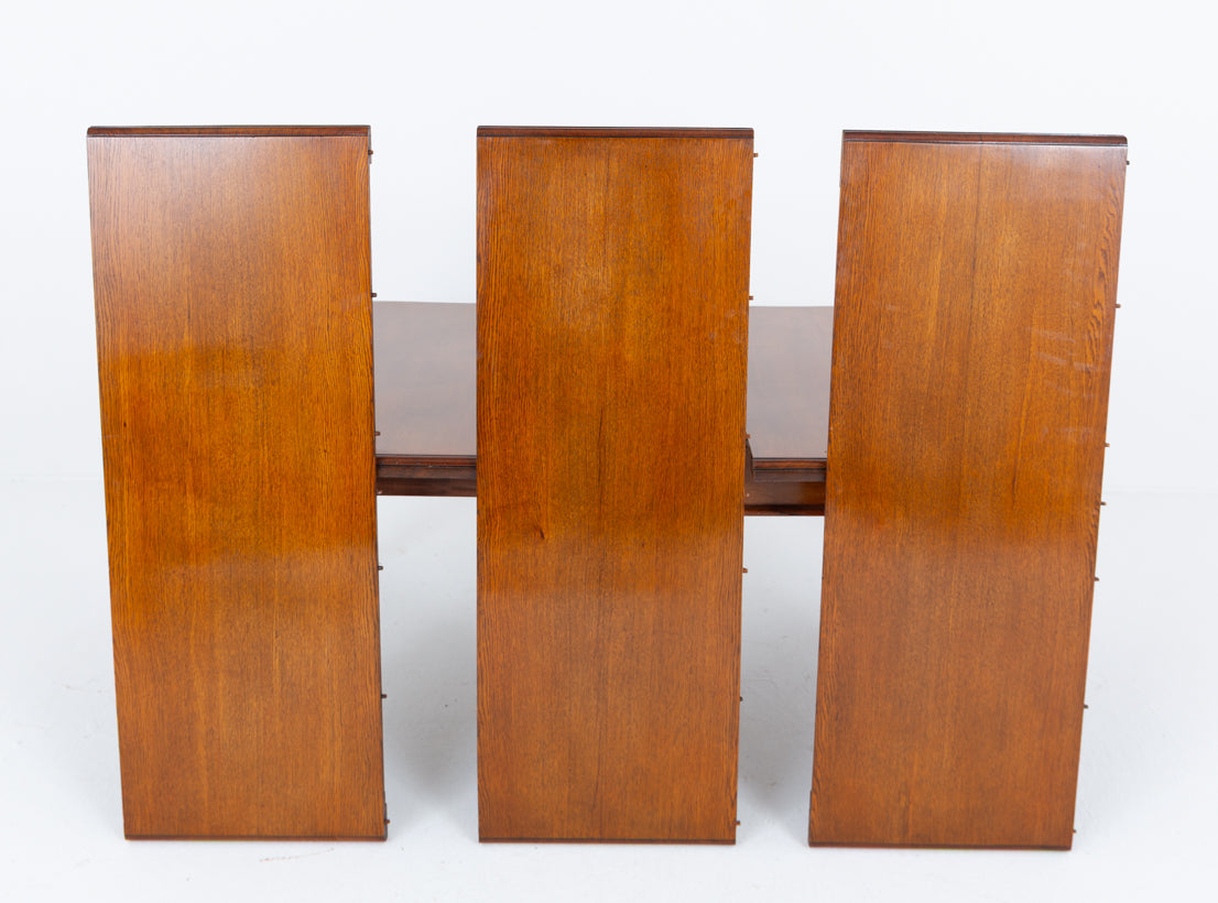 It extends smoothly by way of a traditional wind-out telescopic mechanism and will accommodate up to three additional leaves, enabling the table to comfortably seat 12–14 guests when fully extended.