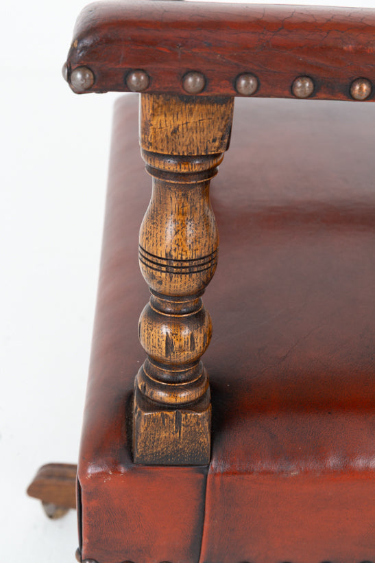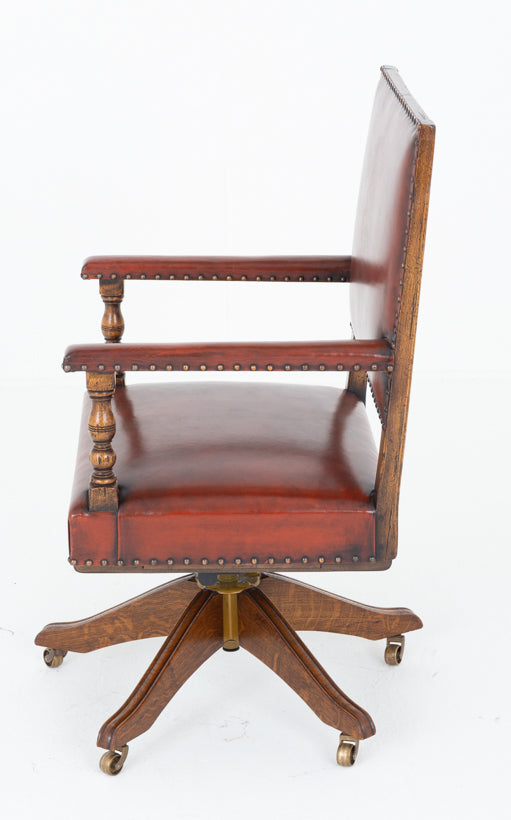 The Chair is Covered in a Conker Brown Hide and Finished with Brass Stud Work.