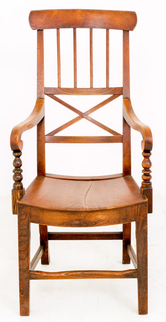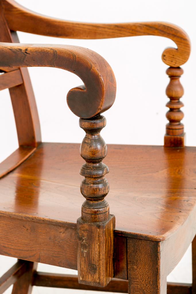Highly Unusual Elm Country Chair. Standing on square tapered legs with an "H" frame. The Arms are supported by ring turned columns.