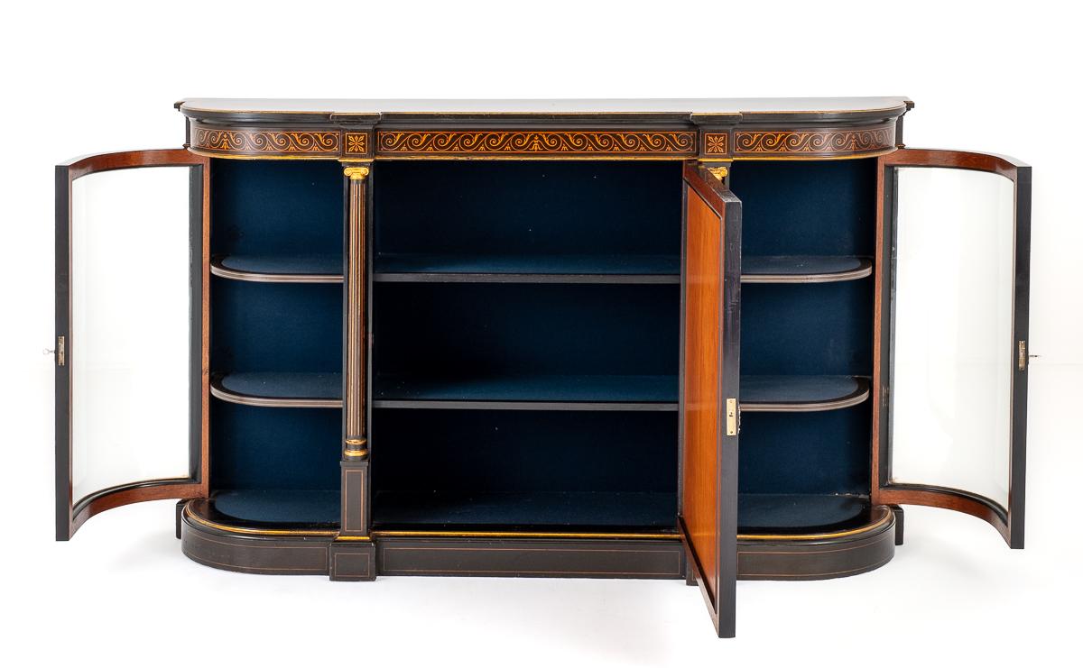 This Victorian Ebonised and Walnut Credenza Stands Upon a Plinth Base.