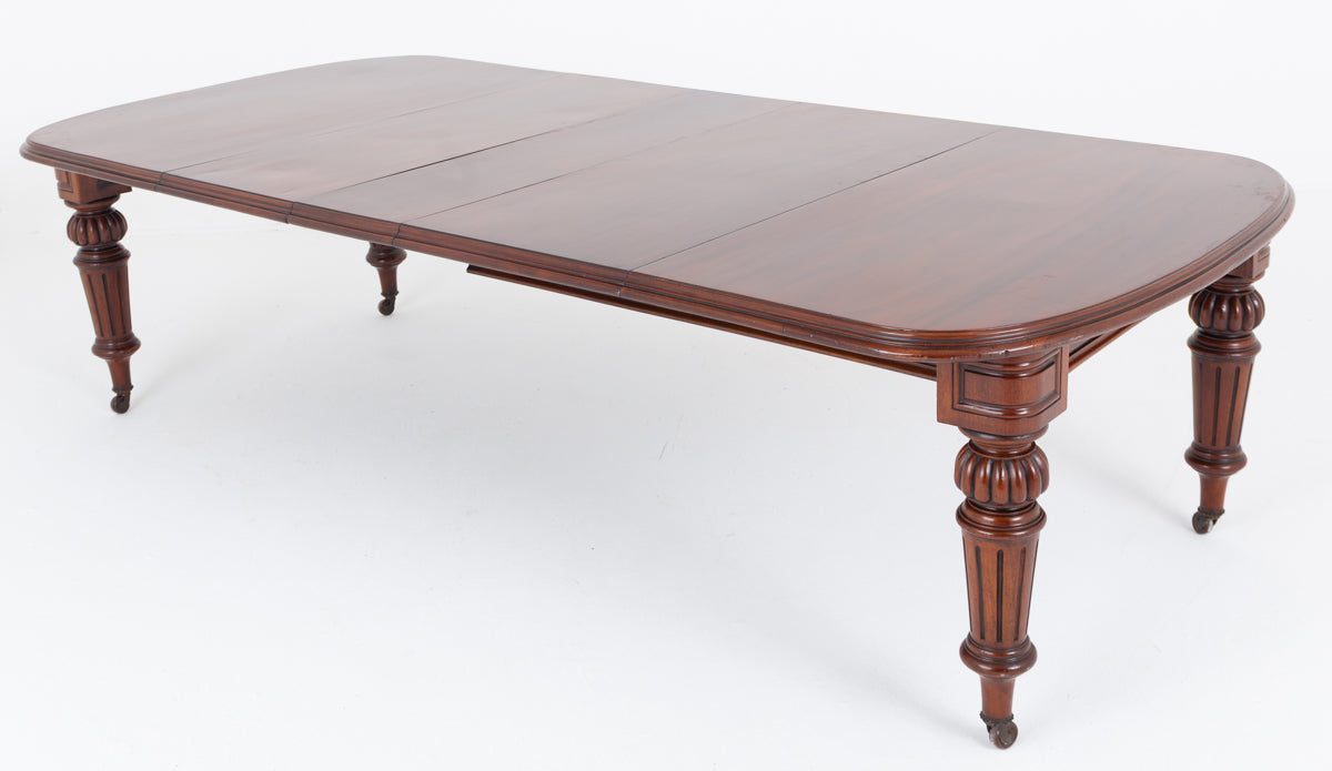 A fine Victorian mahogany extending dining table of impressive scale and elegant proportions. The table is raised upon beautifully fluted, ring-turned and carved legs, each terminating in the original brass castors. The tops of the legs are further enhanced with carved decorative detailing, showcasing the quality of craftsmanship.