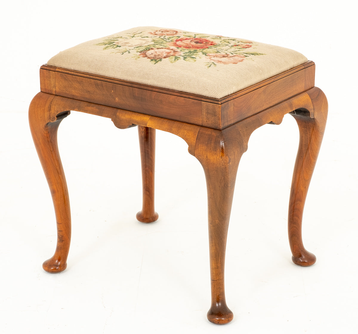 Featuring typical Queen Anne legs with pad feet a shaped apron and retains the original tapestry to the seat.